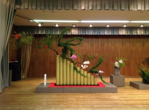 フェスティバルでは、メンバーによる華展と、在阪各国総領事館のいけばな作品が展示されました。10:30から開会式が行われ、外務省から関西担当大使 三輪昭様、I.I.会長片野順子様、I.I.世界大会委員長のご挨拶。ご来賓には、在阪各国総領事やご夫人などがお見えになりました。続いて能「高砂」山本章弘様。12:00から14:00までは、留学生対象のいけばなワークショップ。嵯峨御流から、私も含めて多数の会員が作品を展示し、ワークショップにも、嵯峨御流が参加協力いたしました。