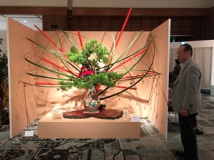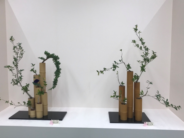 写真でご紹介するのは、嵯峨御流の作品です。嵐峡の景を立派にいけられていました。
