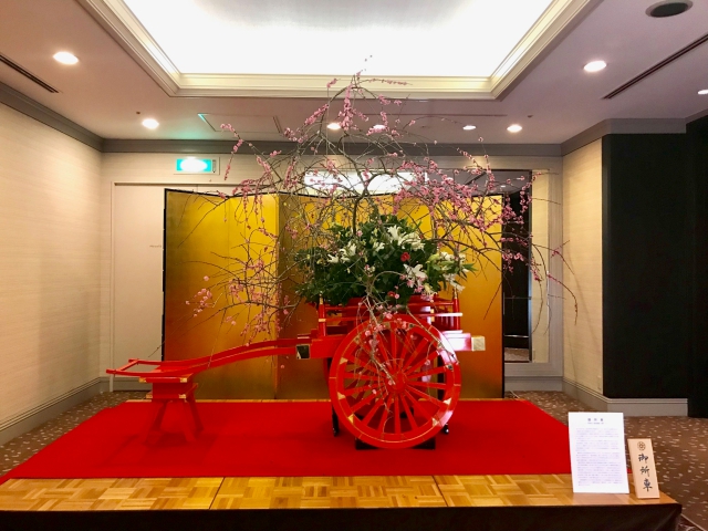 あわせて、嵯峨御流華道総司所 華道家により、お祝いの花が御所車にいけられました。