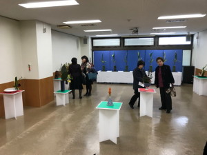 蠟梅を用いた七種宝器の作品、山から海までの風景を階段状の設えにして景色いけで表現された作品、などなど会員皆様の力作を拝見したり、花材を探すご苦労話などを伺うことができました。