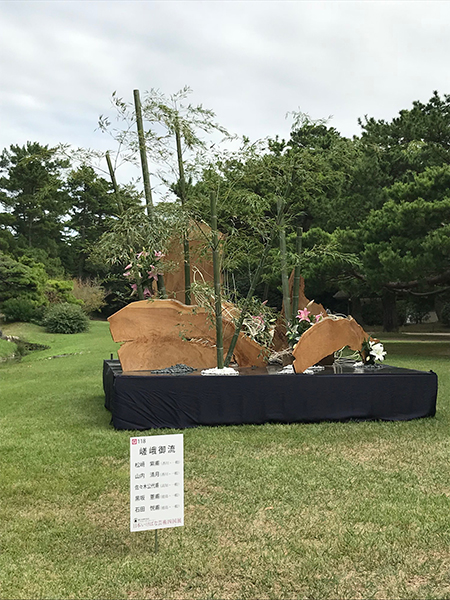 私も、小川先生はじめ嵯峨御流関東地区の先生方に大変お世話になり、屋外展示の制作と4日間のお手入れ、また25日の「9流派によるカキツバタをいける公開制作」では小川先生に助手をしていただきました。