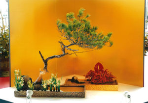 沖縄県名護市の同市役所に諸流派が持ち回りで作品を展示していますが、9月14日に嵯峨御流が担当し、比嘉康甫師範が「3密の1つ密集をさけて」のテーマで挿花しました。