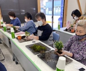令和3年度の司所研究会野外研修「苔玉(こけだま)作り」を10月3日、高松市の高松盆栽の郷で実施しました。2年ぶりの野外研修とあって楽しそうに苔玉を制作しました。いけばなと苔玉は植物を扱う意味で通じるものがあり、熱心に講師のお話を聞きながら取り組んでいました。出来上がった苔玉はそれぞれ個性が出ていてオンリーワンの作品でした。