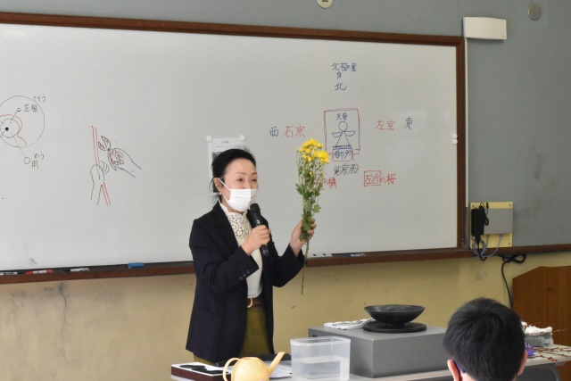 小学校では茶道体験、中学校では華道体験が実施されており、11月11日に嵯峨御流が西陵中学校での華道体験を担当いたしました。