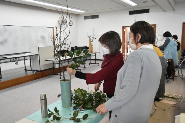 午後の実技では、受講生は梅と椿を使って乙朔日の花に取り組みました。