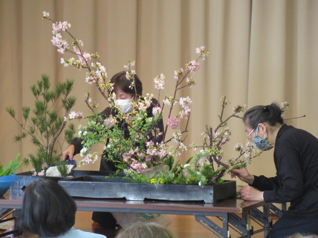 北九州市の黒崎市民センターで3月5日、黒崎まちづくり協議会、黒崎市民センター共催の生け花ライブイベント「春の訪れを感じる生け花のパフォーマンス-ピアノとマリンバの演奏とともに-」が開催され、藤村純月師範が挿花、植田規容月師範が嵯峨御流をはじめ大覚寺、嵯峨天皇についての説明を行いしました。多くの方が来場して会場は満員。見事にいけあがった景色いけ嵐峡の景や海浜の景を見ていただくことができました。作品はこのあと場所を移し、センターを訪れる多くの方にご覧いただきました。