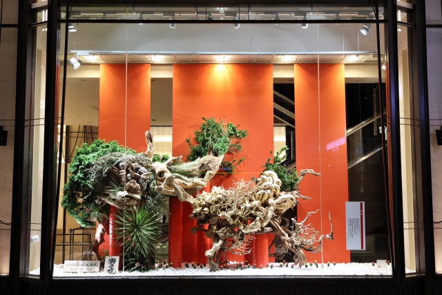 2023阪急百貨店ショーウインドー迎春花が展示中です。
