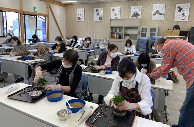 高松市の高松盆栽の郷で10月15日、野外研修を開催しました。今回は盆景制作というちょっと難しい課題でしたが、皆さん熱心に取り組んでいました。器に盆栽と石で景色を作り出すところはいけばなにも通じるところがあり、出来上がった盆景はそれぞれの個性が出た作品になりました。