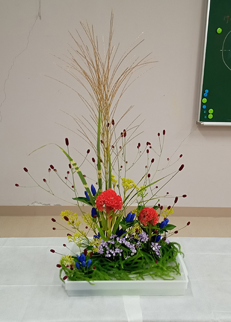 昨年に続き、「水辺の景色をいけよう」というテーマで実施しました。まだまだ暑い中でしたが、少しでも秋の気配を感じていただきたく、景色の「野辺の景」に挑戦していただきました。すすきをはじめ、おみなえしやわれもこうなどの秋草を使い、緑化センターの刈りたての「ひかげのかづら」も使わせていただき、いきいきとした秋の野辺の景色を3歳から大人の方まで、楽しんでいけ上げていただきました。