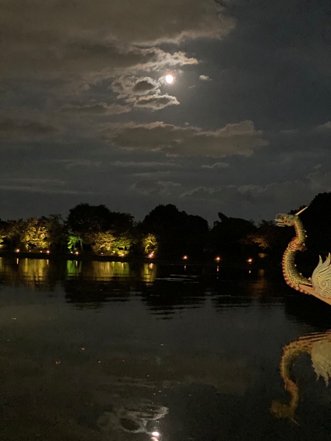 写真は、昨年の月をわたくしが撮ったものです。こんなにきれいに池の水面が鏡のようになっているのは、職員の方々総出で何度も何度も池に入って菱狩りや蓮刈りをされた賜物です。