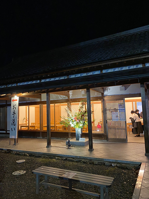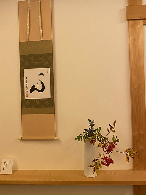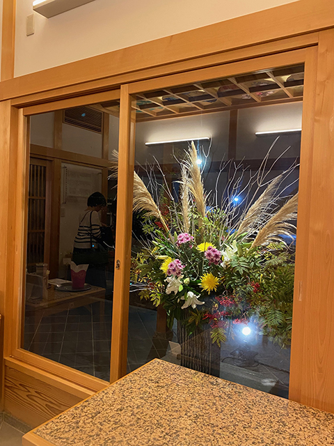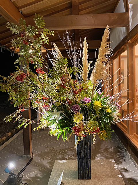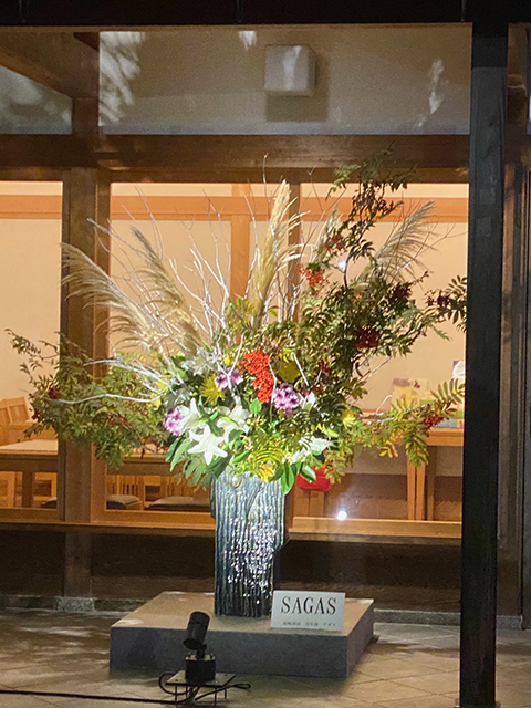 嵯峨御流青年部SAGASの作品 観月の夕べにて 2025.10.06 | 華務長からのお知らせ 10月4日から6日までの観月の夕べの期間、嵯峨御流青年部SAGASの作品が蓮華殿前に飾られています。 室内からも映えるよう配慮なさって、とても良い感じ。