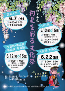 羽咋市文化協会の「令和7年度 初夏を彩る文化祭」が6月に市内各所で行われました。その一環として、いけ花展が6月13~15日にコスモアイル羽咋で開催され、当流は能登司所が出瓶しました。