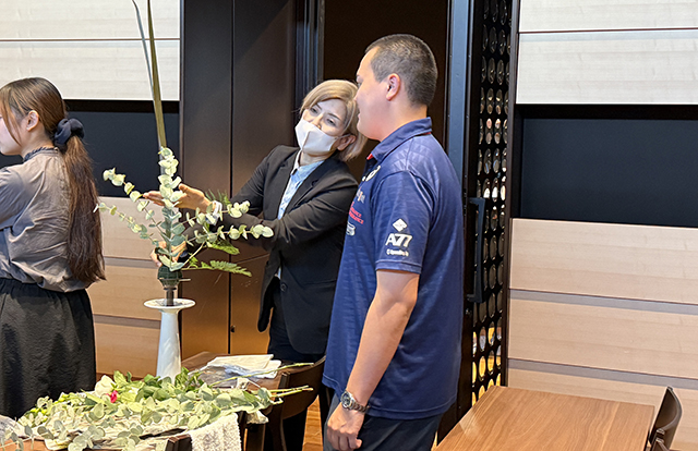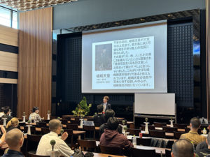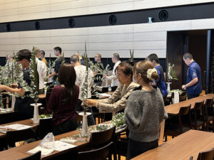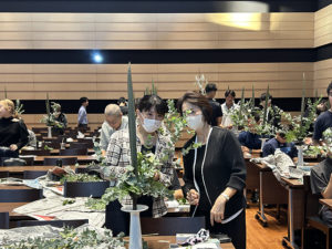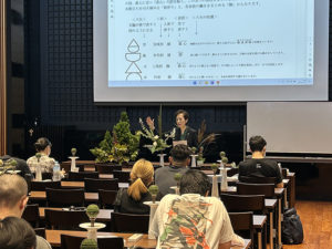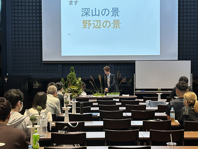 前半は辻井ミカ華務長による講義とデモンストレーションが行われました。命の根源である水の流れが、山から海まで連続して流れることにより、風景が生み出される。その風景をいけばなで表現する、嵯峨御流独自の花態「景色いけ」から「深山の景」「野辺の景」を助手の石田啓甫先生と共に紹介し、「いけばな」は生命感の表現であること、「景色いけ」は自然を守りたいという心を育てるものであることを説明されました。