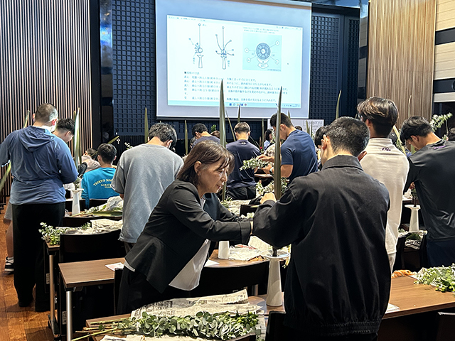 後半は、谷田緑甫いけばな文化綜合研究所長による荘厳華の実技指導が行われました。荘厳華について解説した後、教授の石田啓甫先生、納富貴甫先生、准教授の谷口陽甫先生、宮武裕甫先生が実技指導に加わり、学生たちは花器「そわか」に真の真を挿花しました。多くの学生にとって初めての体験となりましたが、苦戦しながらも熱心に取り組み、荘厳華への理解を深めました。
