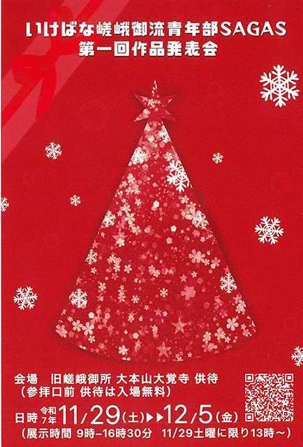 いけばな嵯峨御流青年部SAGAS 第一回作品発表会 2025.10.29 | 講座・イベント情報 日 時:令和7年11月29日(土)~12月5日(金) 展示時間:午前9時~午後4時30分 ※11月29日(土)は午後1時から 会 場:旧嵯峨御所 大本山大覚寺 供待