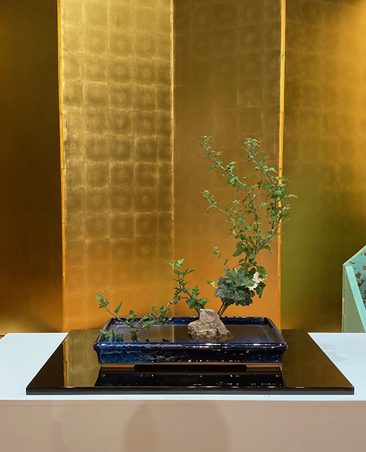 初めに大覚寺大沢池で菊をたおられ殿中の瓶に自らいけられた嵯峨天皇の故実に基づく「伝書第五巻『菊水生方の心得』」庭湖石を水盤に据え、寒菊で。