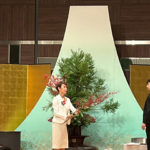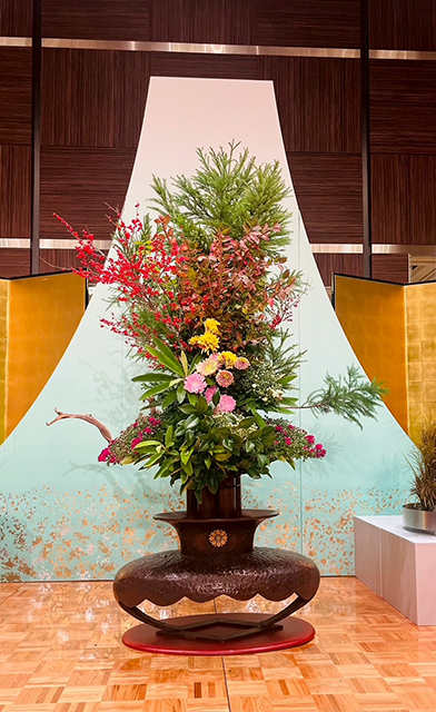 6作目 令和8年御題「明」に因み、嵯峨御流オリジナルの御題「明」花器を用いて、掛けくつわ を披露。