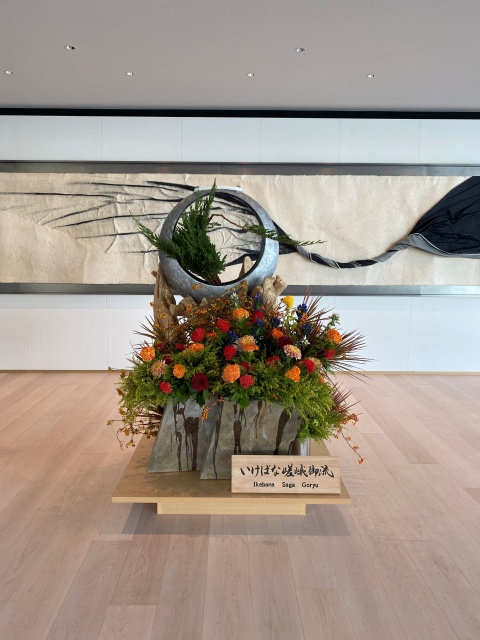 大阪・関西万博 迎賓館に挿花した作品 2025.11.07 | 華務長からのお知らせ 万博迎賓館のお玄関に、日本いけばな芸術協会が挿花。9月1日から15日まで、嵯峨御流が担当しました作品です。 秋の風景。 月花器に富士山。