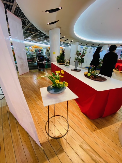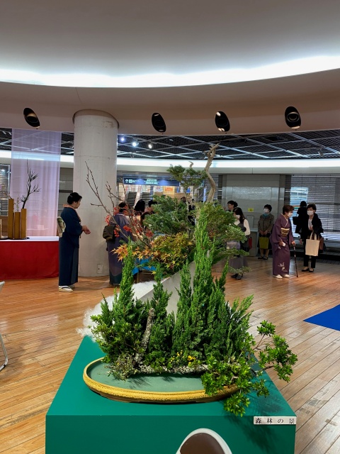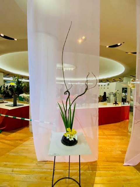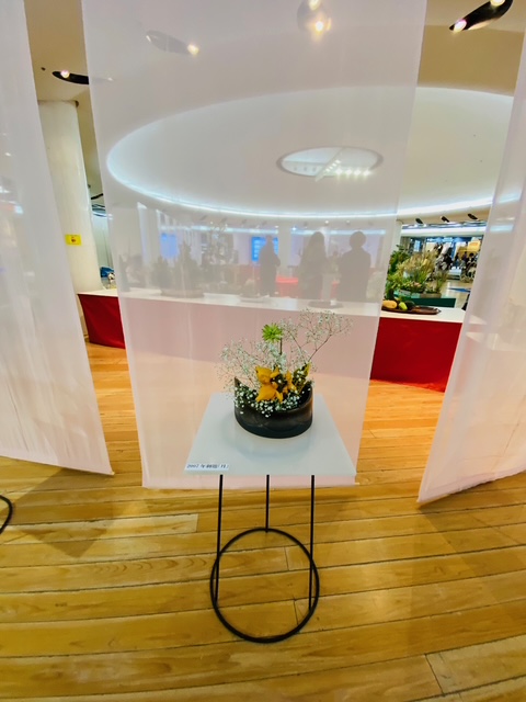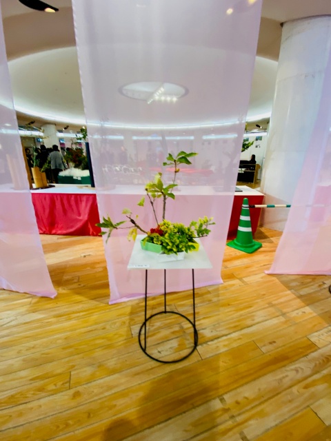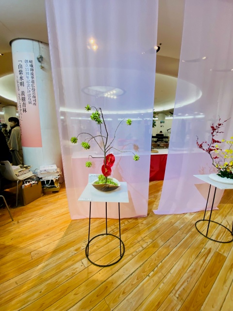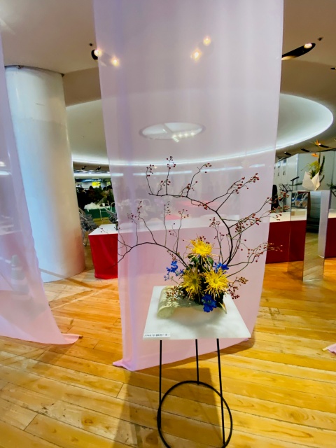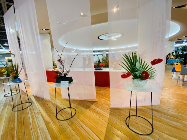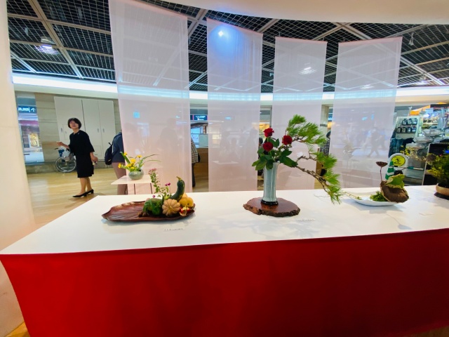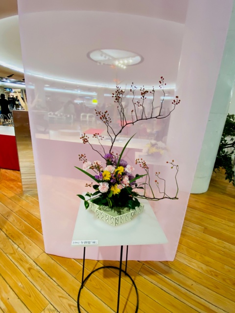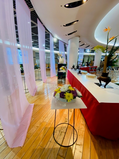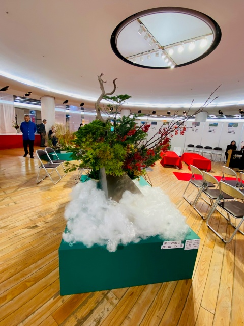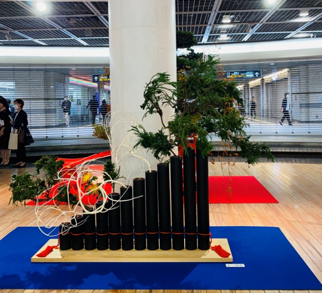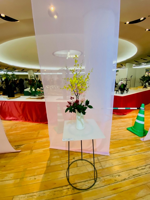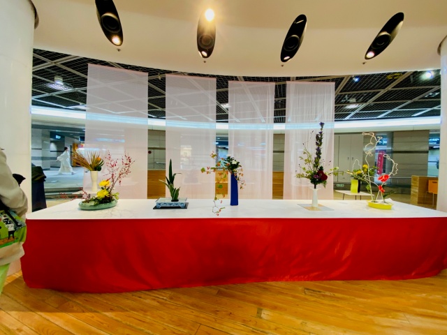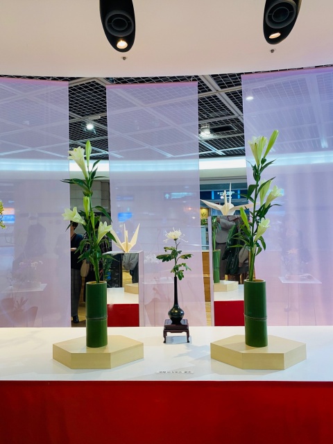 10月24日、25日に広島芸南司所の創立55周年記念華展が、人々が往来する地下繁華街の中央広場でたくさんの方々の注目を集める場所で開催され、開始にあたり被爆80年平和祈念セレモニーが執り行われました。平和記念公園の方へ向かって献花一対を捧げられた後、理事長、華務長挨拶、オペラ歌手山岸玲音氏の歌唱、セレモニー参列者による献花。