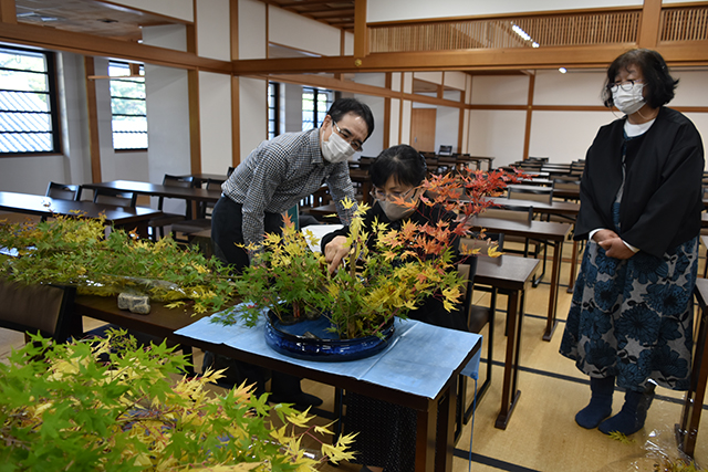 午前は景色いけや高雄の景についての説明の後、参考花の挿花が行われました。午後からは日本のけしきシリーズのビデオを鑑賞した後、実技に移りました。大きな照紅葉、青紅葉に苦戦しながらも、受講生は熱心に取り組んでいた様子で、大変充実した時間となりました。