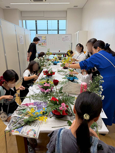 【全国いけばな体験リレー】北播司所 10月5日 西脇市茜が丘複合施設「Miraie」で実施 2025.11.18 | いけばな通信 令和7年10月5日(日)、西脇市茜が丘複合施設「Miraie」(みらいえ)で「みらフェス」が開催されました。 子供から大人まで全ての世代が様々な体験ができるイベントです。そこに「いけばな体験」のブースを設け「輪盛体」を計画しました。初心者の方にも分かりやすいよう工夫し、5~78歳の男女の参加者で大盛況。笑顔の花がいっぱい咲きました。 司所長/眞鍋直甫