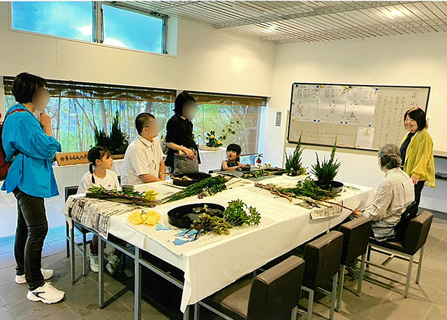 全国いけばな体験リレーについて説明し、会場の参考花やパネルを使って嵯峨御流の景色いけ、七景の話をしました。最初はどれだけの人が来てくれるか少し不安もありましたが、四世代一緒に来てくれた人や、男性、幼稚園児や小学生も参加してくれ、賑やかに、交流しながら楽しく過ごすことができました。