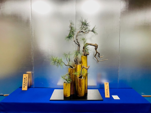 10月8日。総本山 本隆寺での華展、玄関正面に飾られた松の作品と。