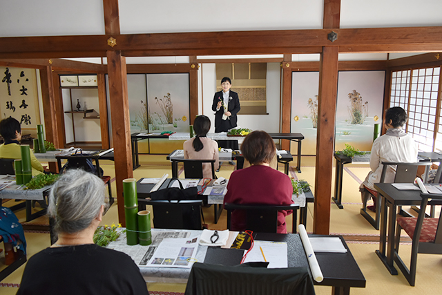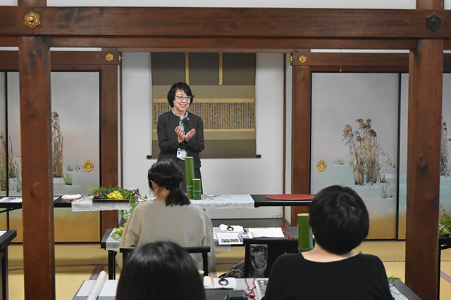 華道総司所による特別企画、ワークショップ「嵯峨菊をいけよう」を11月15日、大覚寺庭湖館で開催しました。