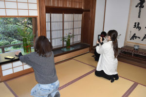 京都や大阪をはじめ、東京、広島など全国各地からの参加者が門外不出の嵯峨菊を是非一度触れてみたかったと、ご応募いただきました。大覚寺嵯峨菊は、毎年11月開催の「嵯峨菊展」で寺内でご覧いただくことはできますが、触れたり、ましてや剪ったり、いけたりすることは通常は出来ません。そして会場も通常非公開の「庭湖館」での体験です。貴重な体験に皆様大変喜んでおられました。