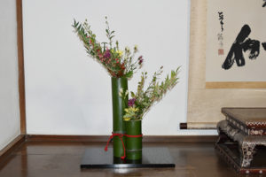 今年は気候の具合で、菊の開花が少し遅かったのですが、大覚寺竹林の青竹を花器にして、嵯峨菊を想い想いにいけていだだくことができました。