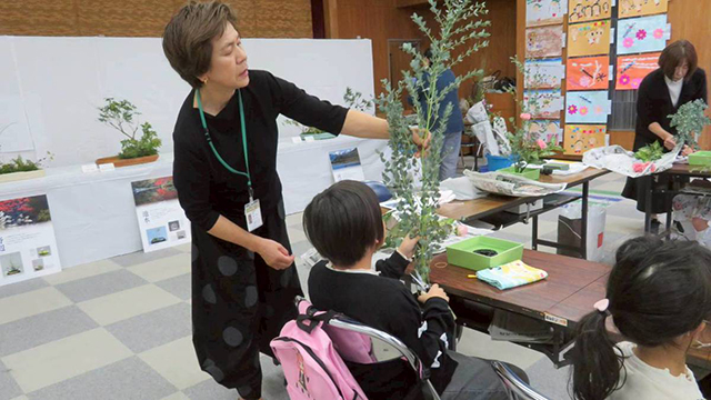 子供が対象で、低学年と高学年の二部制で行いました。低学年の部には経験者がおられましたが、はさみが握れなくて困っている子も見られました。高学年の部には経験者はいませんでしたが、説明をよく聞いてくれていたので、出来栄えは良かったです。文化祭の会場でできたため、七景をいけてある中で、パネルの説明も見ることができてよかったと親御さんから言っていただけました。