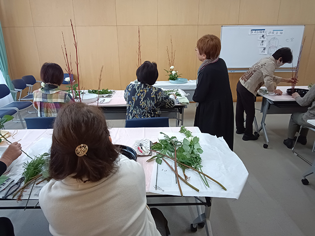 最初にこの体験の趣旨説明から始まり、その後参考花のいけ方の説明し実技体験に移りました。また、会場2階には七景を展示しました。。花材・内容ともに適切で、参加者からは「楽しく体験できた。」、「又参加したい。」という声を多くいただきました。
