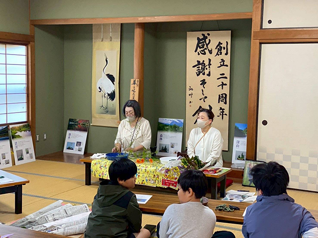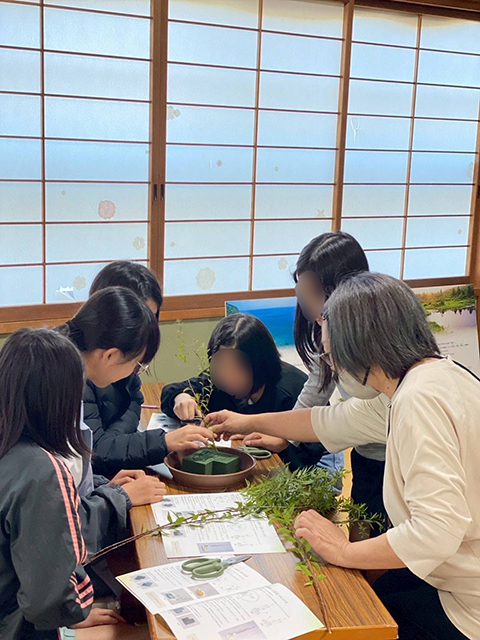 様々な分野の職業体験の1チームとして参加し、5・6年生31名の児童がいけばな体験に興味を持ってくれました。キラキラと目を輝かせて取り組む姿に癒やされ、質疑応答も交えながらあっという間に時間が過ぎました。児童らの作品は学校側の協力で校内に飾り置き、鑑賞できるよう配慮してもらいました。今後も興味を持った児童が教室に通ってくれるかも、と希望が持てました。貴重な体験ができ、感謝の気持ちでいっぱいです。