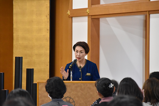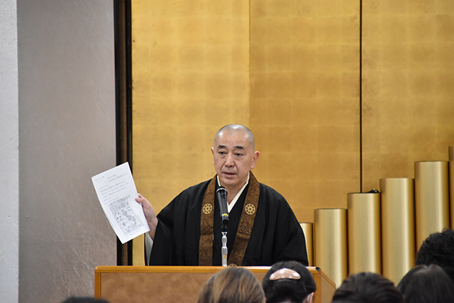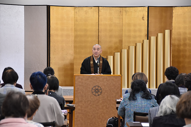 特別講師として、旧嵯峨御所大覚寺 前・総務担当執行の岡村光真僧正に、「大覚寺の名宝を語る」と題して特別講演をしていただきました。大覚寺の宝物に関する謎や、今年1~3月に東京国立博物館で開催された特別展「旧嵯峨御所大覚寺~百花繚乱御所ゆかりの絵画~」についての秘話などをお話いただき、受講生は真剣に聞き入っていました。