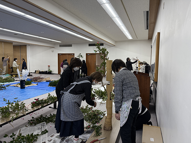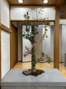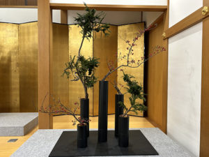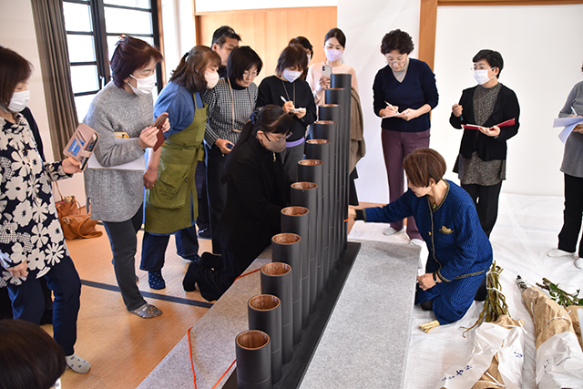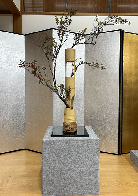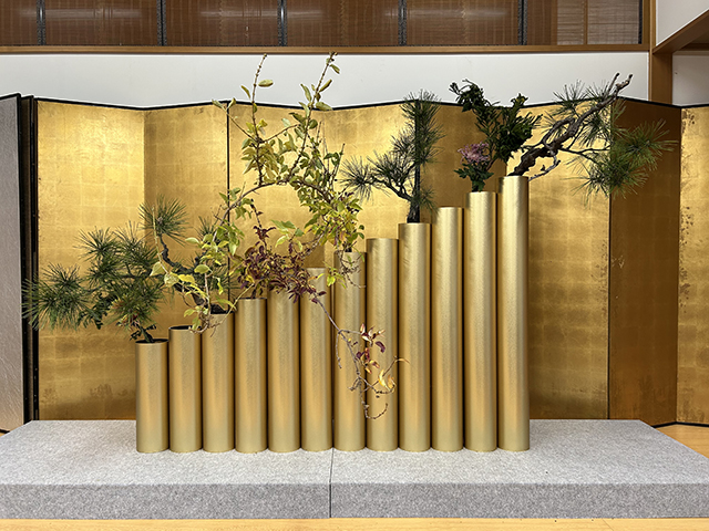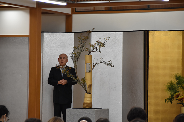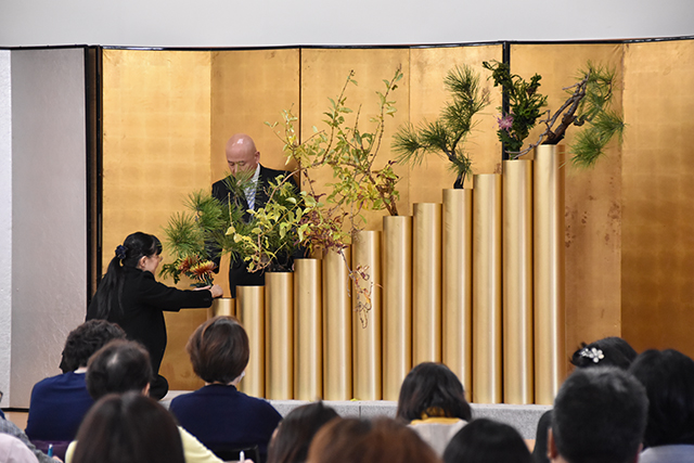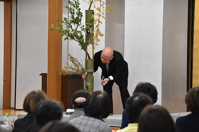 講演の後、辻井ミカ華務長、青野直甫華道企画推進室室長、村上巨樹華道芸術学院長、谷田緑甫いけばな文化綜合研究所長によるデモンストレーションが行われました。まず辻井華務長がテーマについて説明した後、青野室長、村上学院長、谷田所長がいけ込みのポイントを解説しながら、十二律管、五重切、五管筒、三重切に挿花しました。