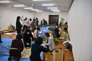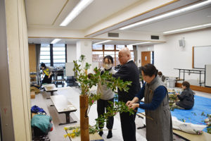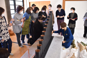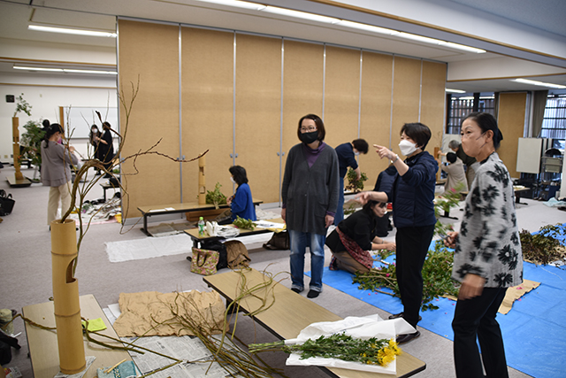 午後からの実技は、デモンストレーションと同じ十二律管、五重切、五管筒、三重切のグループに別れ、その中で2人以上のグループになり、取り組みました。指導は辻井華務長、青野室長、村上学院長、谷田所長、福居邦鷹華道企画推進室副室長、澤井尚甫・眞鍋直甫両華道芸術学院副学院長、内橋人美いけばな文化綜合研究所副所長が担当されました。コミュニケーションを取りながら花材と花態に向き合って、皆協力して作品をいけ上げました。受講生は講演にデモンストレーション、実技と充実した一日を過ごしました。