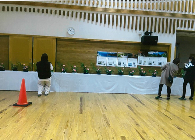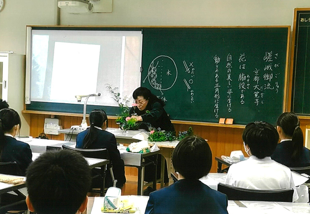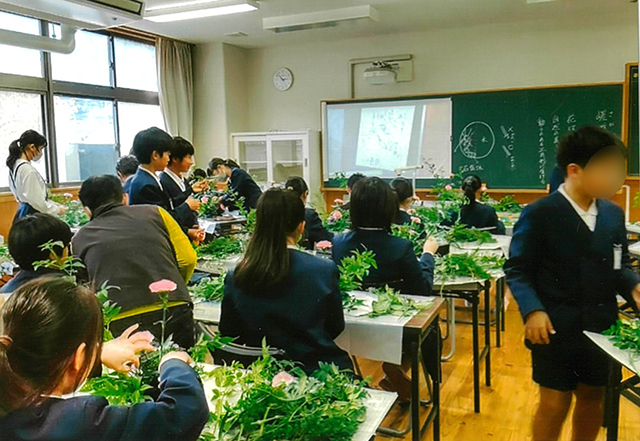 事前に生徒達にテキストを渡していただいていたので、皆さん興味津々でした。人数が多かったため、七宝の形にテキストの内容を書いたメモを作り、見てもらいながら役枝をしっかりといけてもらえるよう説明しながら参考花をいけさせてもらいました。皆さん自然の美しさを楽しみながらいけてくれました。いけ上がった花は翌日の人権参観日に見てもらうためにホールに運び、嬉しそうに美しい姿を確認していました。翌日パネルと一緒に多くの方に見ていただき、「いけばなをしたと話は聞いていたが、クオリティが高くてびっくりした。」とお話してくださったそうです。