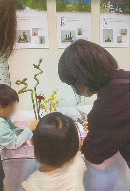 東みよし町文化まつり内での開催で、就学前の子どもから80代の方まで、幅広い世代に体験していただくことができました。会場には七景のパネルを掲示し、七つの景色を展示しました。立盛体の参考花にそって役枝を挿す位置や寸法、角度を確かめながら1本1本丁寧にいけ、花材の名前や水揚の方法についても補足しながら作品を仕上げました。特に子どもたちについては、はさみの持ち方や使い方、花の扱い方等についてわかりやすく説明することに注意を払いました。体験を通して、伝えることの難しさを私達も体験させていただき、貴重な一日となりました。