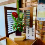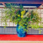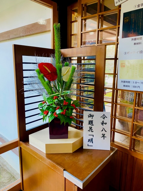 この日、嵯峨御流華務職のわたくしども16名が朝から大覚寺内五大堂・霊明殿・安井堂に「荘厳華」、心経前殿・お口祝いの儀が行われる部屋に「注連の伝の若松」、参拝者の休憩所に「御題花」、供待には大きな松と梅の作品と卯杖を挿花いたしました。