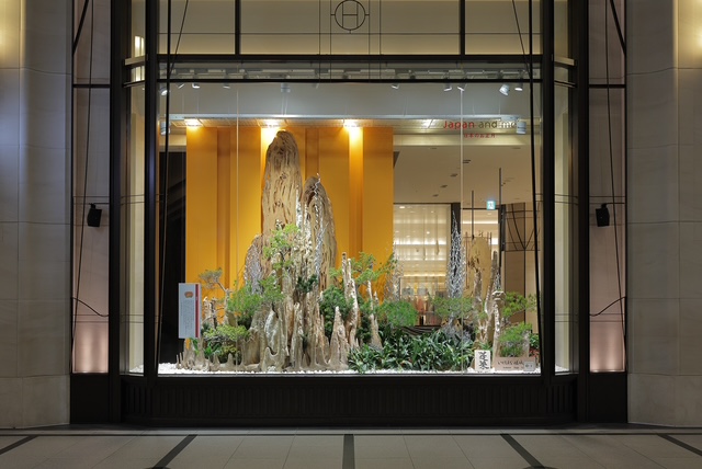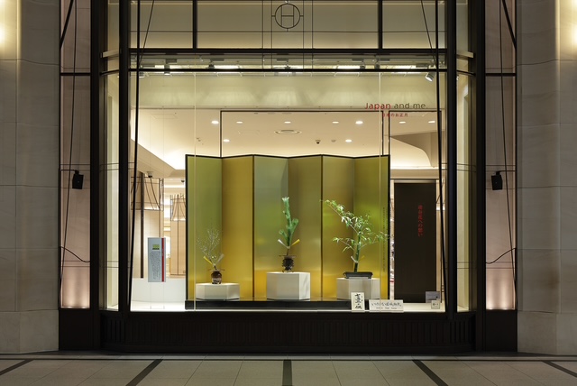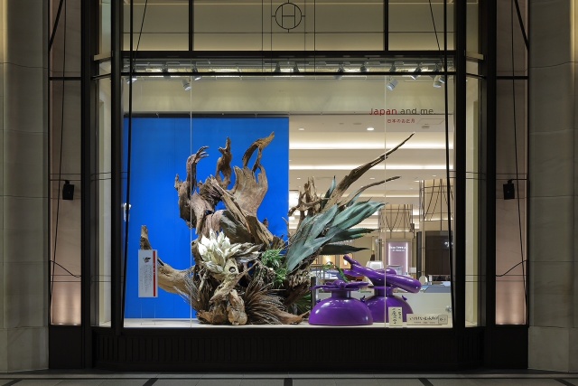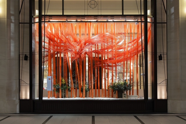令和八年、情熱に満ちた丙午歳が巡ってきました。自然界のエネルギーを表す十干十二支の、「丙」は、太陽のように明るく、炎のように活発で、物事がハッキリと表れる年を意味します。そして「午」は、行動力や躍進、情熱を象徴し、一気に駆け上がっていくような勢いを持っています。この素晴らしい丙午の勢いに乗って、皆様にとって今年一年が、何事にも情熱を持って取り組み、大きく躍進できる年になりますように、心から願っています。ウィンドーを飾るいけばなには、森羅万象の根源とされる地水火風空の五大の要素をそれぞれのいけばなの中に込めて表現いたしました。この作品から、自然の力強い生命力と、あふれるエネルギーを感じていただけましたなら、とても嬉しく思います。