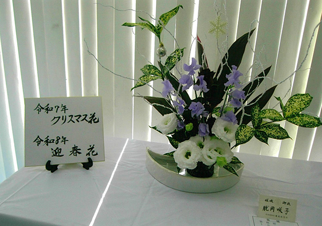 12月14日、神戸市の筑紫が丘自治会館つくしホール1・2階で第34回文化祭が開催されました。34年間毎年出品させていただいており、本年はクリスマス花、令和8年迎春花を出品いたしました。月2回のお稽古で積み上げてこられた成果を発表できる場を、34年間も続けられている事に感謝しております。