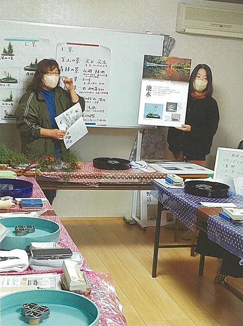 地元の小中学生と先生方が授業の一環として開催し、テキストに沿って進めていきました。初めてで戸惑いもありましたが、司所員のアドバイスを受けていけ上がった作品に松ぼっくり、リボンなどを飾り付け、クリスマス風に仕上げました。顔がほころび、歓声が上がる姿が印象的でした。興味を持ってもらうために教える側もスキル向上に努め、いけばなが次世代に繋がるよう頑張っていきたいと思いました。