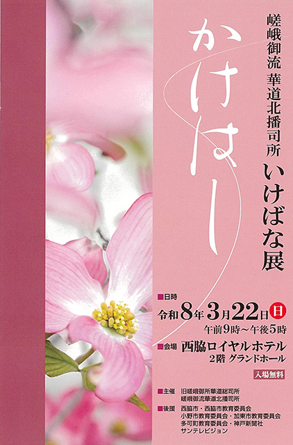北播司所 司所創立82周年記念嵯峨御流いけばな展「かけはし」 2026.01.19 | 講座・イベント情報 日 時:令和8年3月22日(日)9:00~17:00 会 場:西脇ロイヤルホテル 2階グランドホール 主 催:旧嵯峨御所華道総司所・嵯峨御流華道北播司所