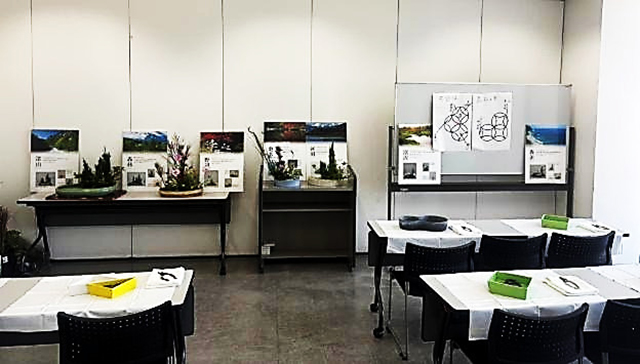 前回のいけばな体験の経験から、参加者が募集よりも増えることを想定して花材を少し増やし、各先生方が自宅から多めに持参した花もほとんど使用しました。景色いけを見てなるほどと、感動した様子が覗えました。