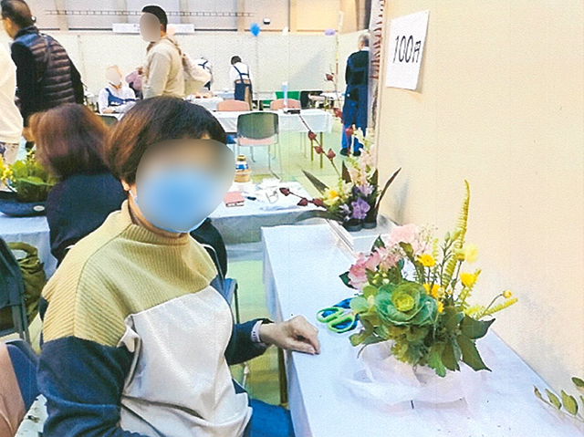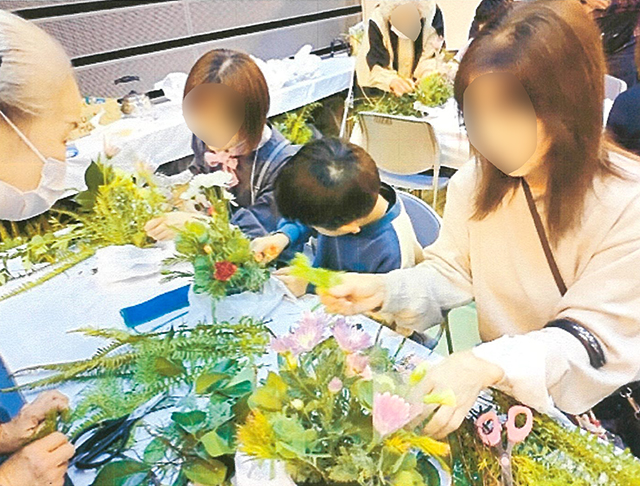 橋本市のイベント「すこやか橋本 まなびの日」の会場内にコーナーを設けての開催でした。当初は子どもを対象にしていましたが、想定よりも少なかったため、会場に来られている方どなたでも参加してもらえるよう対象範囲を拡大しました。その結果、子どもから高齢者まで幅広い年齢層の方に体験してもらうことができました。また、聴覚障害の方々も手話ボランティアの方と一緒に参加され、いけばなを楽しんでいただきました。