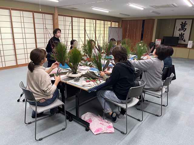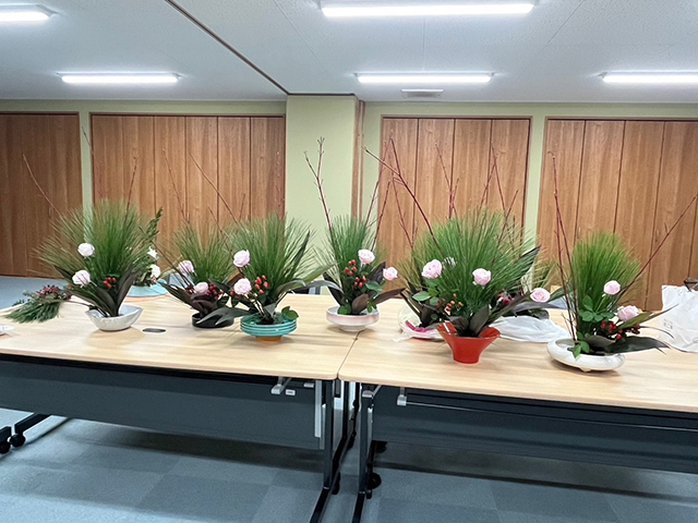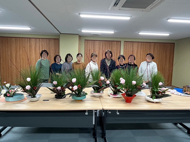 参加者の要望で、せっかくなのでお正月をいけてみたいということで、お正月をいけていただきました。50~60代の方々で、ほとんどの方が初めての体験でした。「こんなに集中できて楽しい。」と言ってもらい、お花をいけることの楽しさと達成感を味わってもらえて、良い時間が過ごせました。