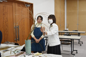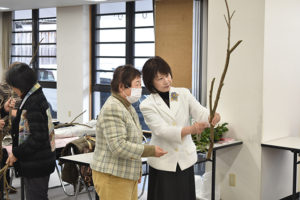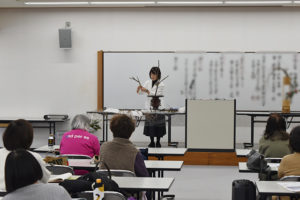 午前中は澤井副学院長が糸柳三景、長閑の景色について、いけ方のポイントなどを説明しながら実技花を挿花されました。
