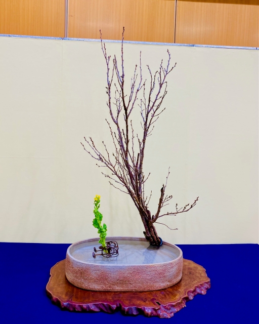 桜は自然の枝ぶりを生かしながら生花にしています。花留めは五徳。