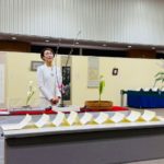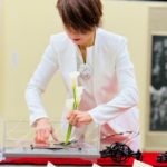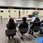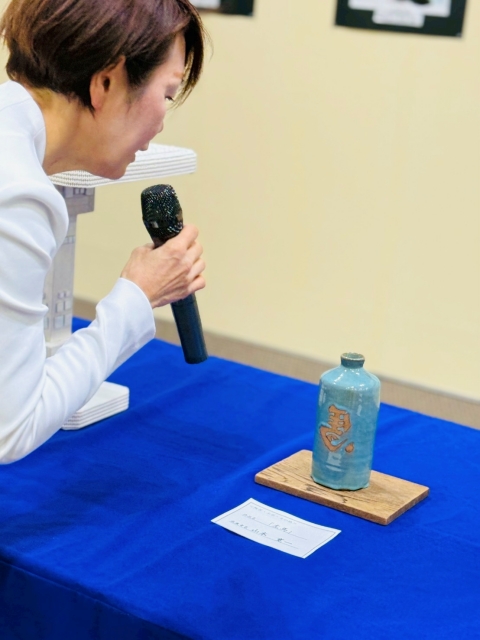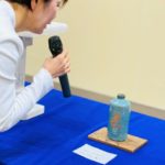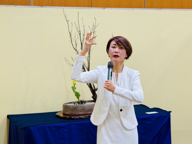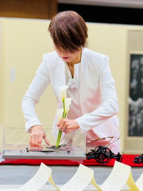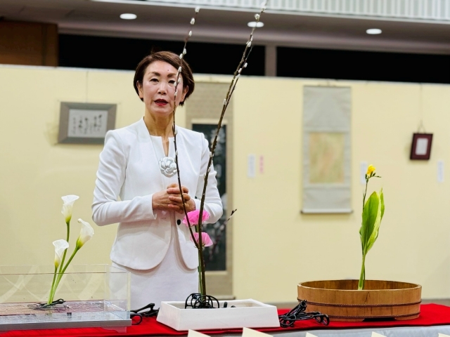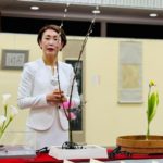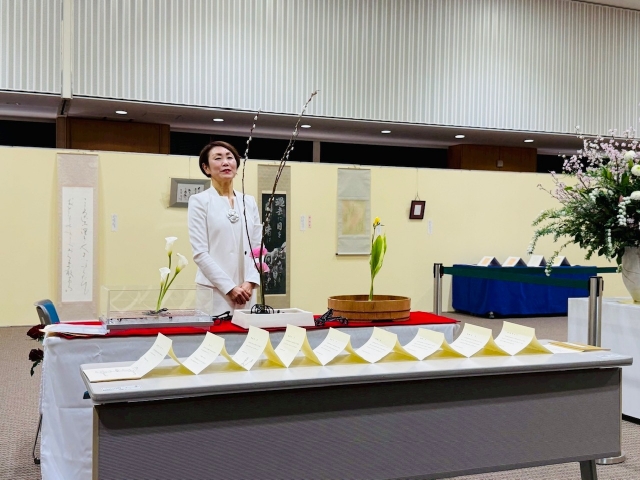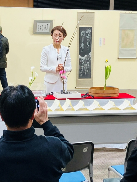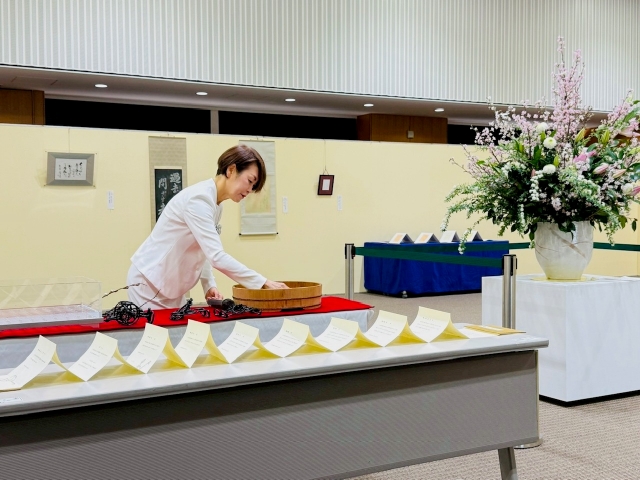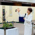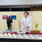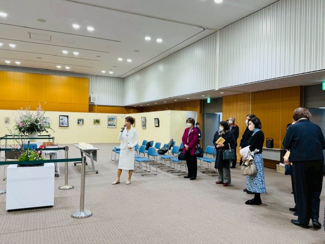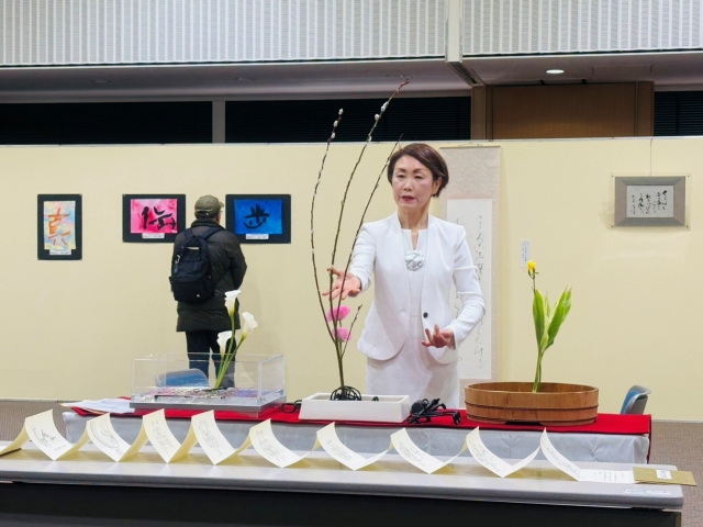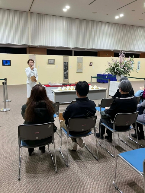 右京区民美術展会場内で、毎日一人か二人の審査員によるギャラリートークがあり、2月14日はわたくしが10時から11時まで担当させていただきました。持ち時間は一人1時間以内ですので、各部門の奨励賞作品をお集まりの皆様とご一緒に見て回った後、嵯峨美術大学・嵯峨美術短期大学 嵯峨御流華道履修生のいけた会場花をご紹介。そしてわたくしの作品「轡(くつわ)留め」も解説させていただきました。残りの時間で、轡を組んで花留に使っていける実演をご覧いただきました。