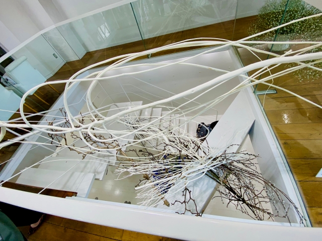 一部吹き抜けのギャラリー1階と地下を繋ぐ大胆な作品が、ギャラリー内に風を起こす感じ。壁や手すりなどあらゆるところを華席にしての個性の共演。